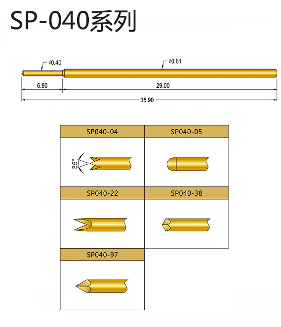 SP040探针的总长度为35.9mm,针管由黄铜镀金制成,而弹簧则采用不锈钢线。