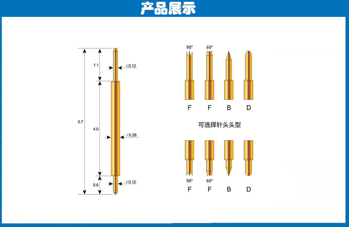 产品头型:探针外径为0.28mm,总长度为5.7mm、针的两端的头型分为尖头、爪头