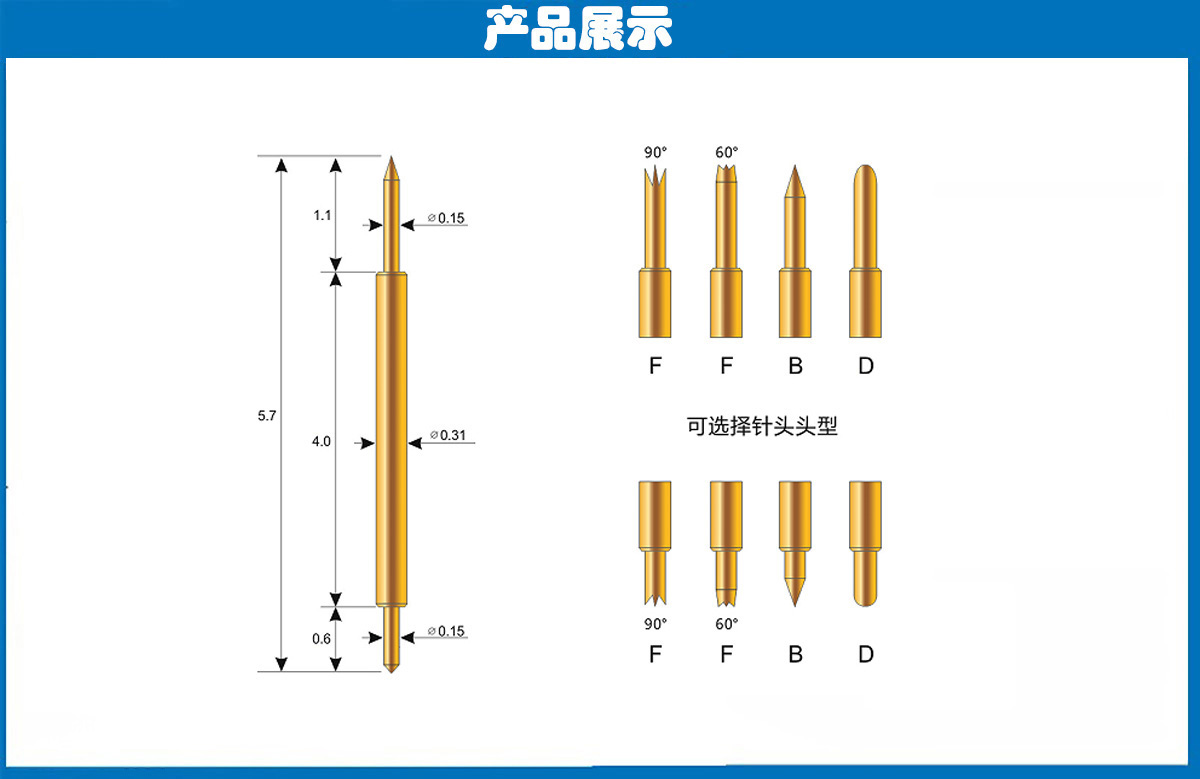 产品头型:探针外径为0.31mm,总长度为5.7mm、针的两端的头型分为爪头