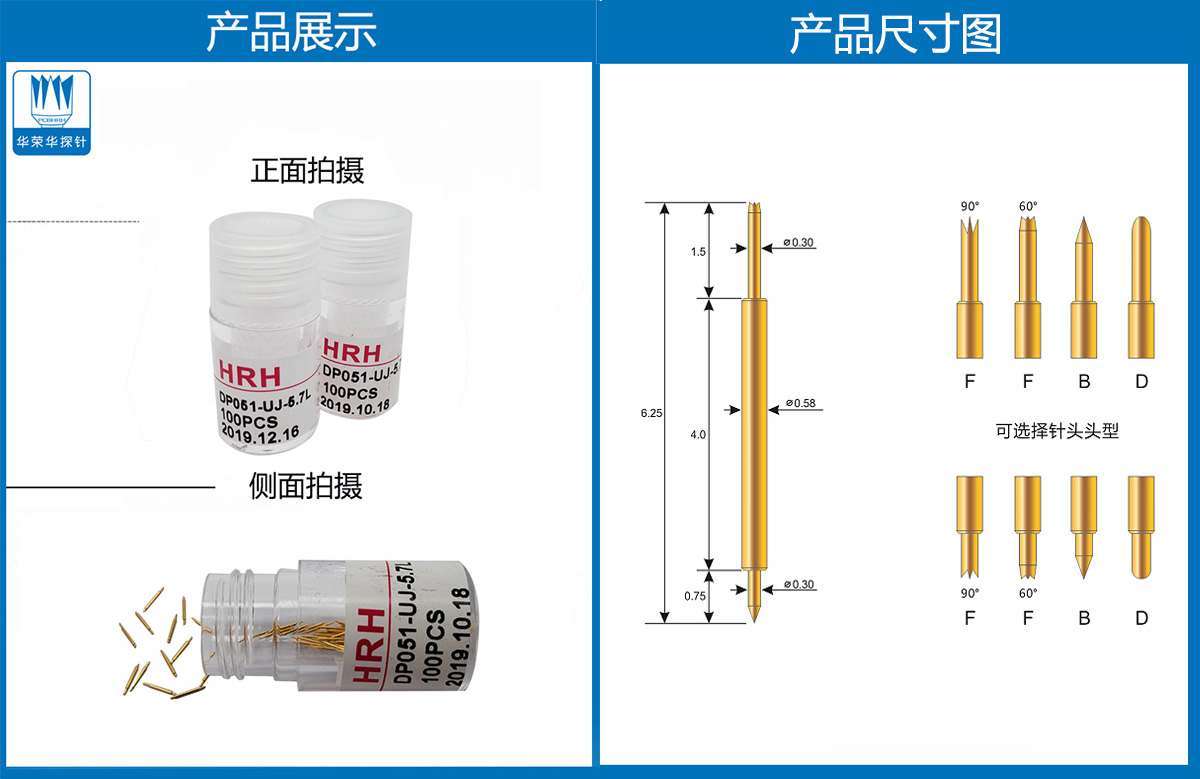 产品介绍:探针外径为0.51mm,总长度为5.7mm、针的两端的头型为爪头,圆头