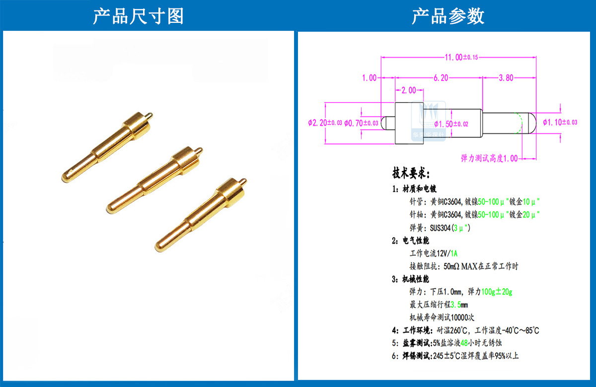 产品头型:探针外径为1.5mm,总长度为11mm、针的两端的头型为圆头
