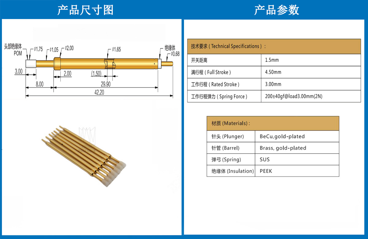 产品简介:KGZ165探针、1.65mm测试针、总长42.20mm、弹簧针、测试针