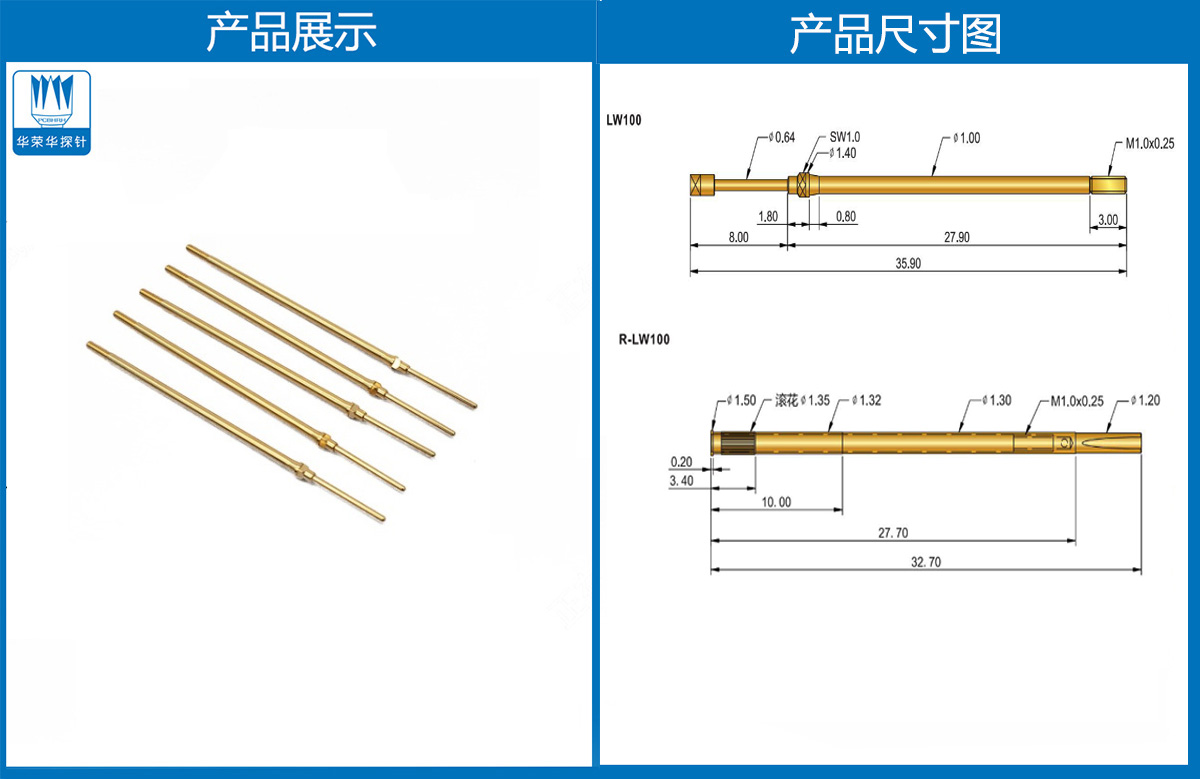 产品简介:LW100线束探针、1.0mm测试针、总长35.90mm、弹簧针、顶针、探针