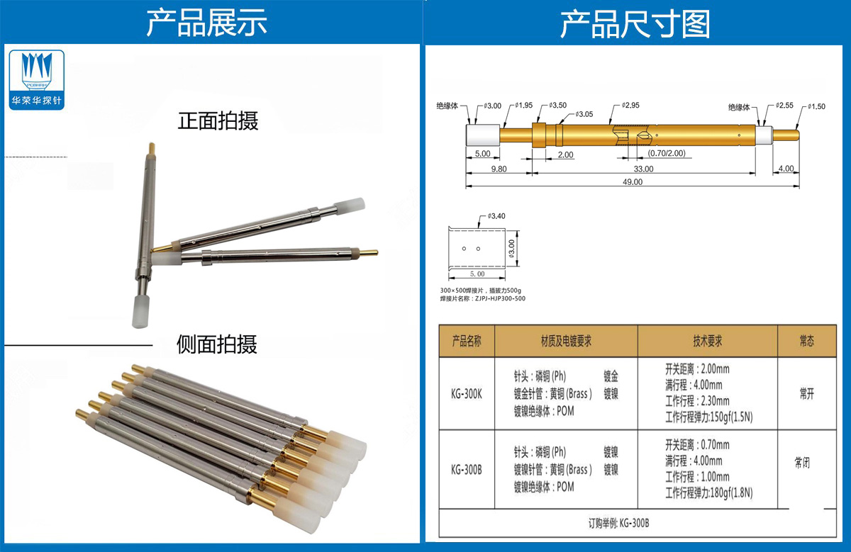 产品介绍:本产品一般用有定向作用的结束测试用,产品选用日本SK4 弹簧选用的是琴钢线。工厂选用的材质都是比较硬的,有利于在测试的时候过大电流不会容易损坏。